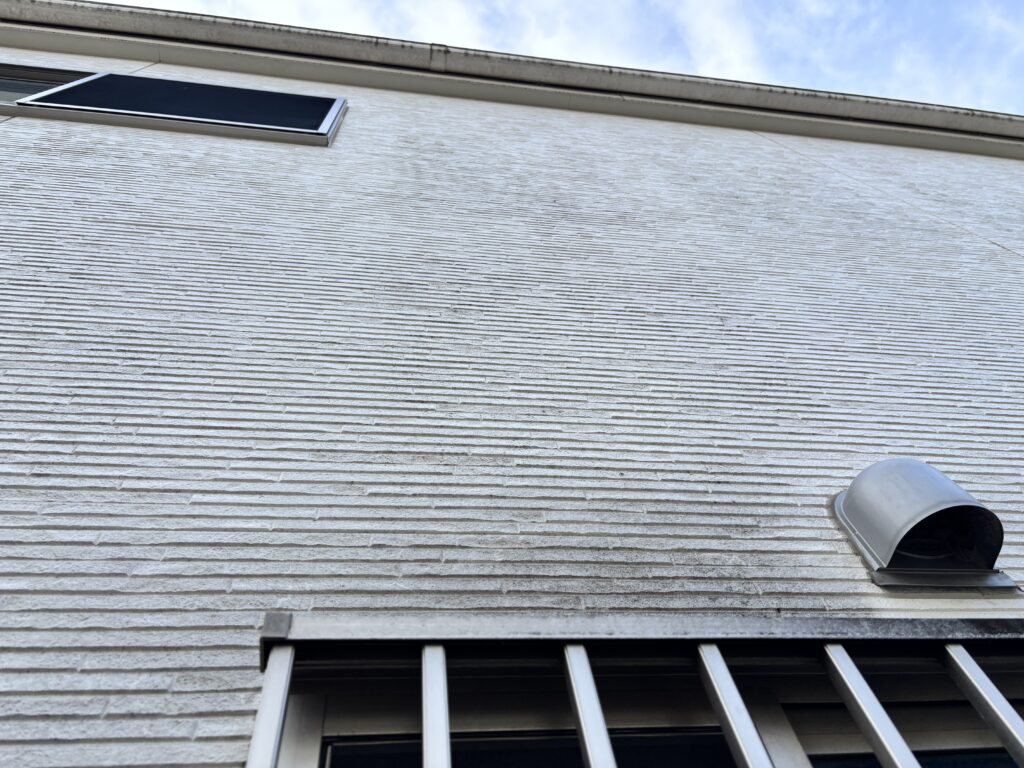 屋根ですが、表層塗膜は完全に劣化しています。反りかえりやクラックが起こる前に塗装が必要です。(反り返りが起こると強風により割れてりまったり、冬場に基材自体に水分を含みやすくなり凍結するとヒビ割れが起きます)。縁切り作業(タスペーサー設置)し、3回塗り致します。