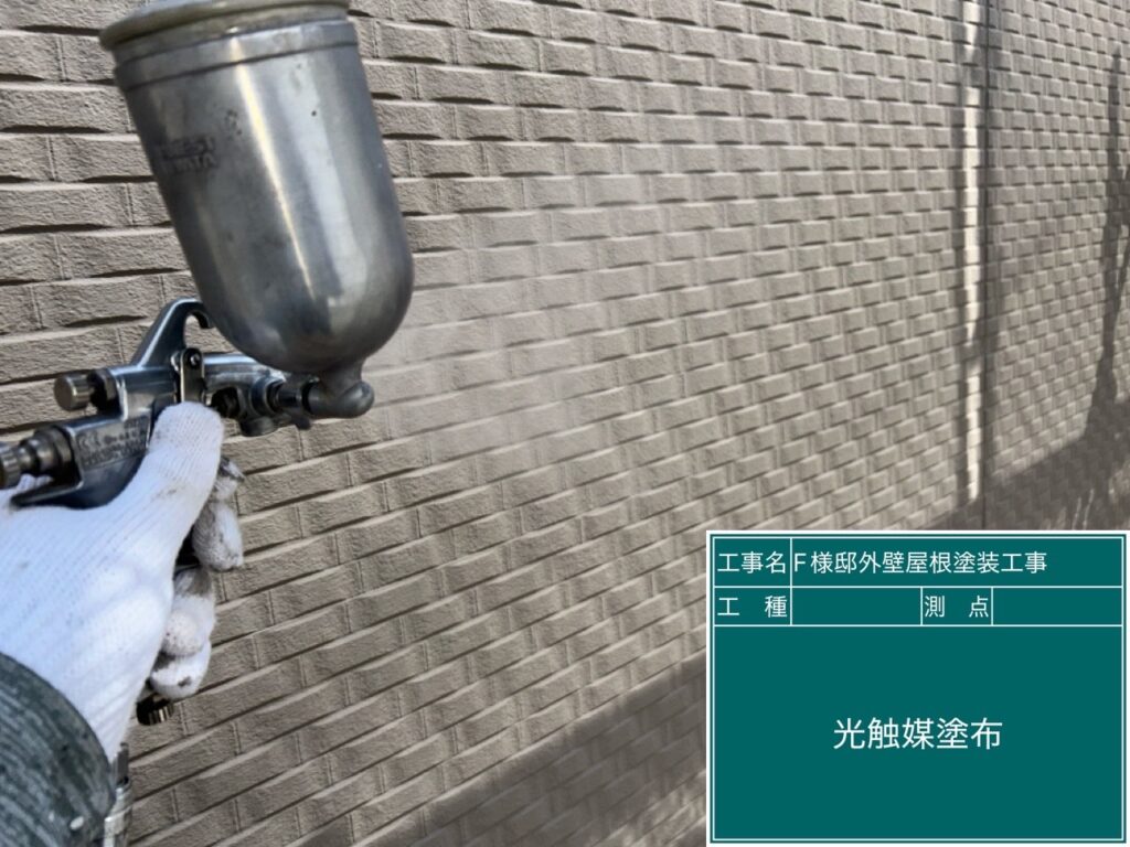 壁に仕上げ材の光触媒プロテクトコーティング(クリスタルシーズンtg)を塗布します。