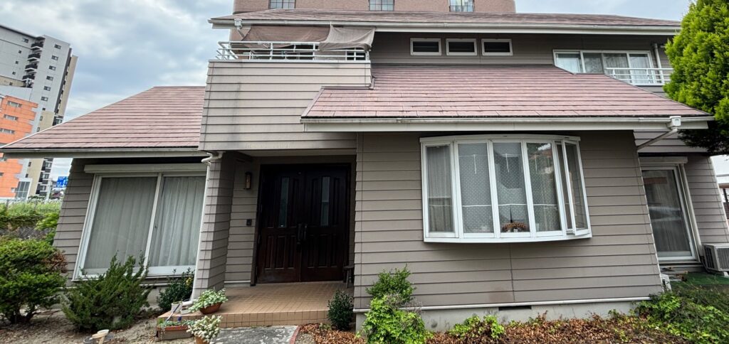 数ある塗装会社より弊社をお選びいただきありがとうございます。F様のお家は築30年、注文住宅のお家で、2回目の塗装となります。お家の状態と致しましては、経年劣化に伴う色あせが、外壁・木製ドア、樋などの付帯部に強く見られました。窯業系サイディングボードの外壁ですので、洗浄(下地調整)後、下塗りを施し主材塗料にて中塗り・上塗りを行います。特にバルコニー壁や西面の壁は日当たりが良く、膨張収縮がかなり激しく起こり続けております。
